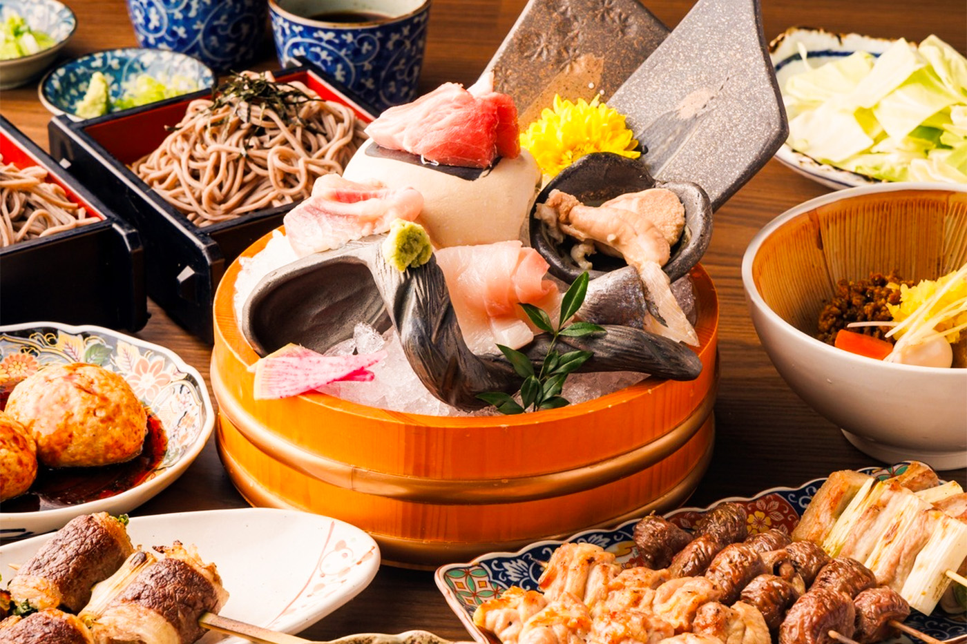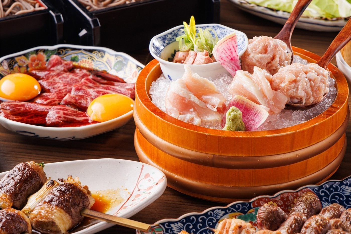 新鮮な刺身を使った刺し盛り、名物の「月見つくね」「和牛すき焼き串」の入った贅沢コースになっております。丁寧に作り上げるこだわりの逸品をご宴会コースでどうぞ。